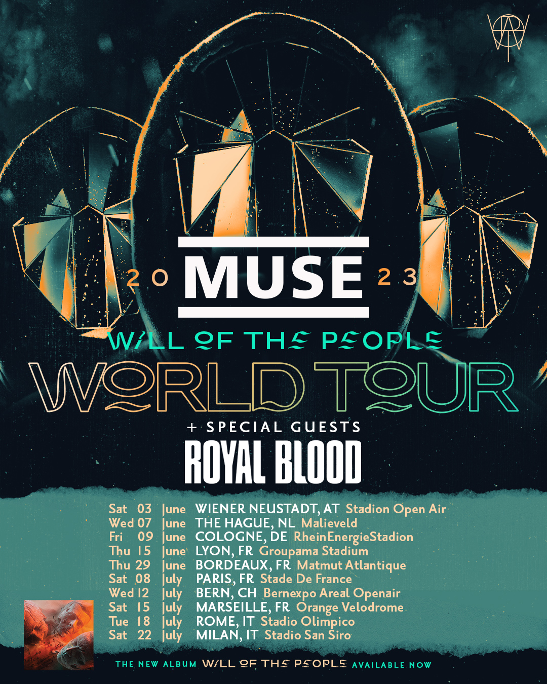 Le groupe Muse annonce leur grande tournée européenne au printemps 2023 , le « Will Of The People World Tour » ! Avec 4 dates en France à Lyon au Groupama Stadium et à Bordeaux au Matmut Atlantique avant d’enchaîner en juillet avec un Stade de France à Paris et un Orange Vélodrome à Marseille.