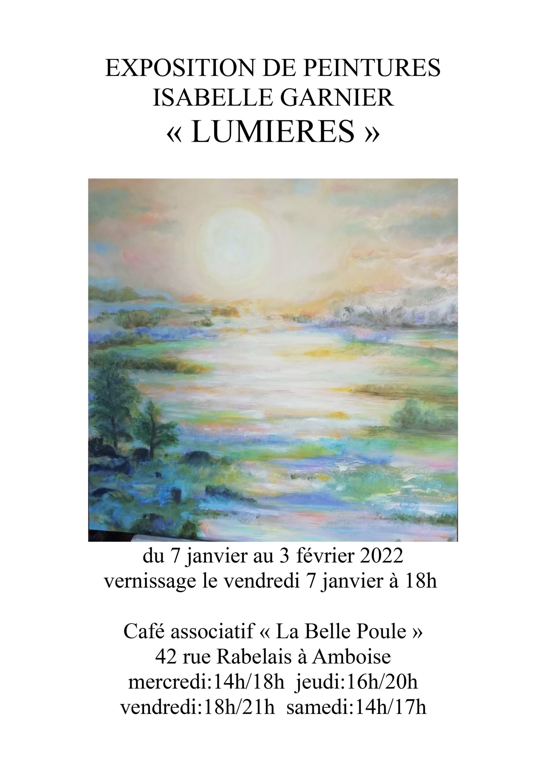 Le café associatif La Belle Poule propose une exposition de peintures d’Isabelle GARNIER « Lumières » du 7 janvier au 3 février.