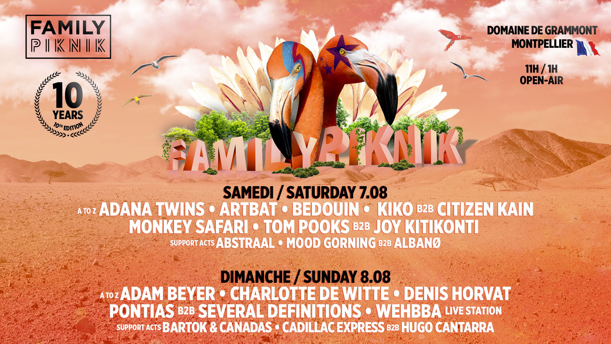 Le Samedi 7 Août mettra à l’honneur la deep, la house et la melodic techno avec le duo ukrainien Artbat, Bedouin, Adana Twins, Monkey Safari, Kiko b2b Citizen Kain et quelques uns des membres du label Family Piknik Music, Tom Pooks & Joy Kitikonti.
